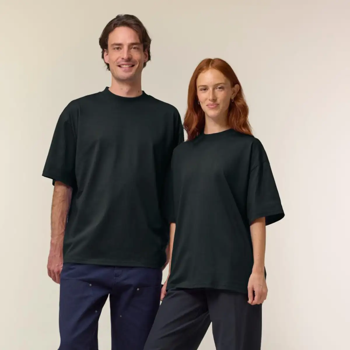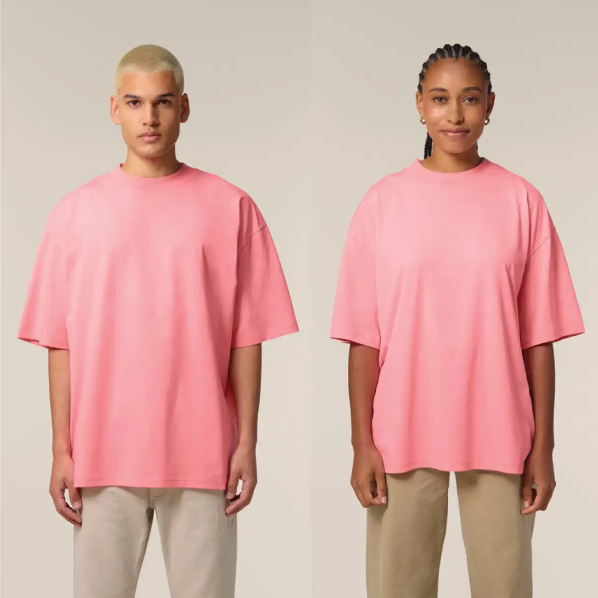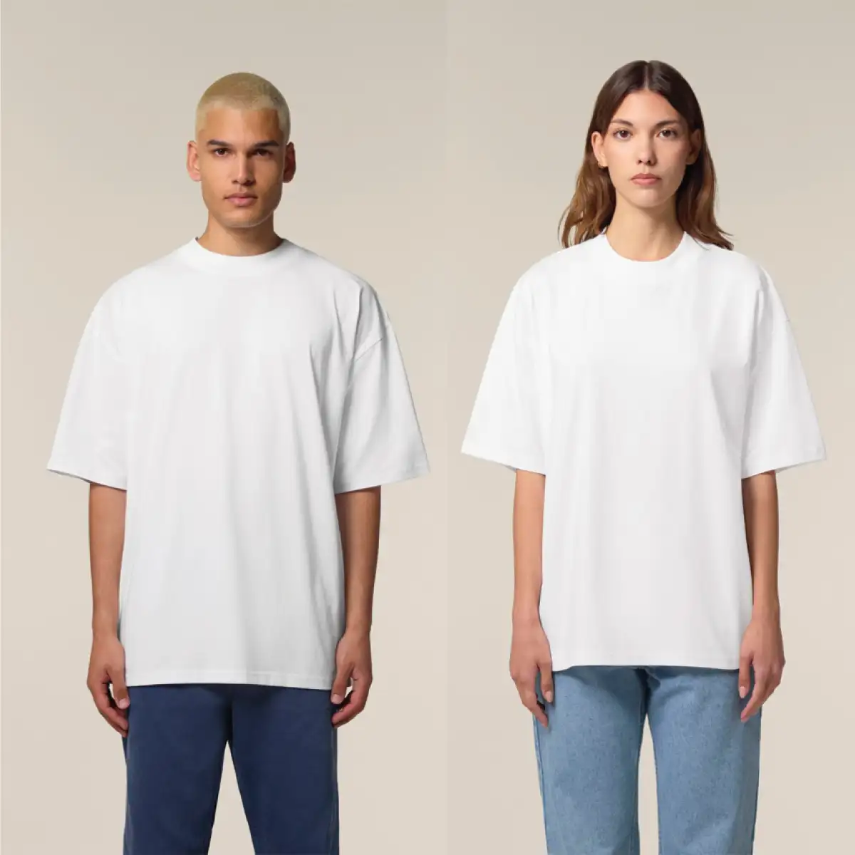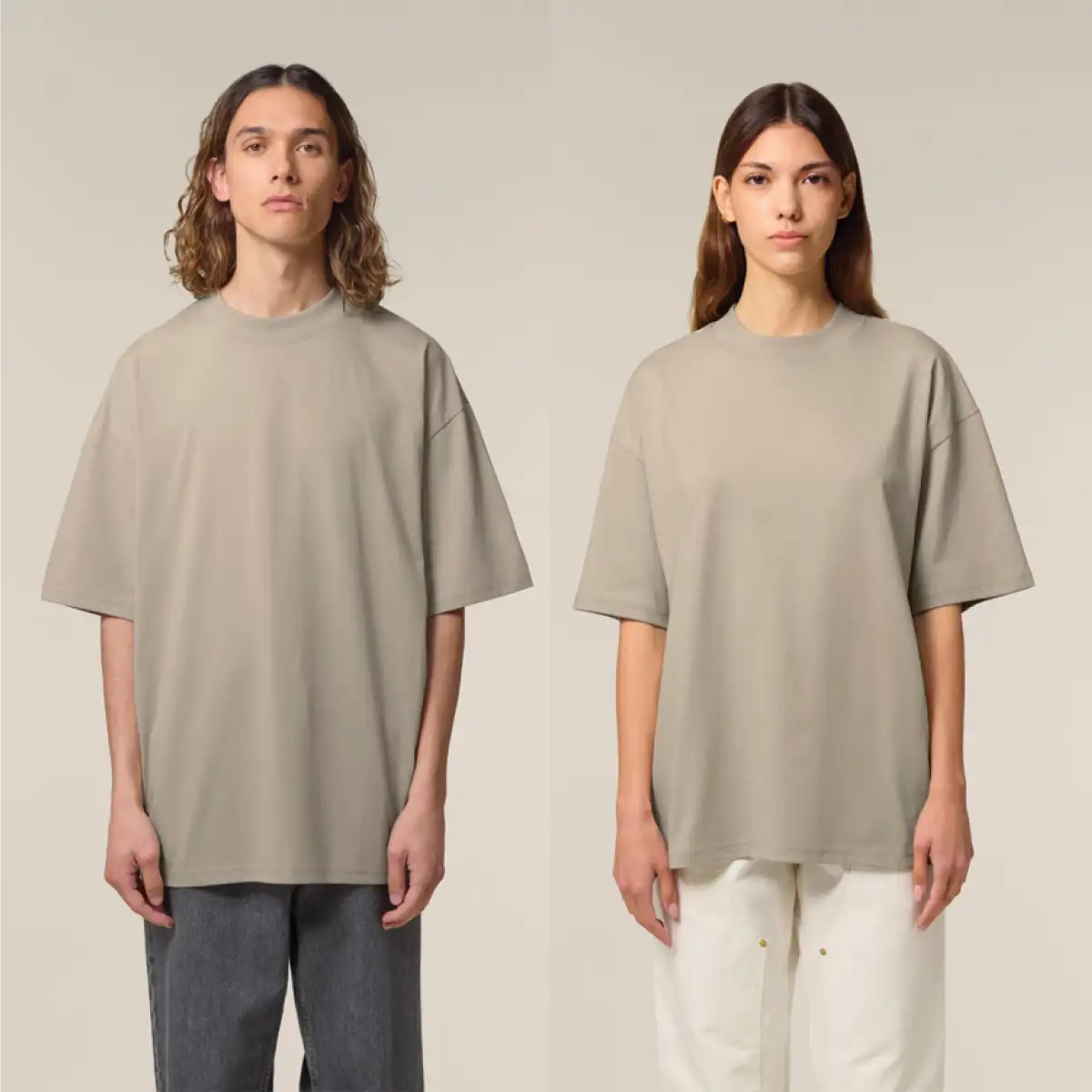 Модерна тениска с овърсайз кройка, изработена от 100% сертифициран органичен памук с висока плътност 200 г/м² – изключително мека, устойчива и екологично чиста.
