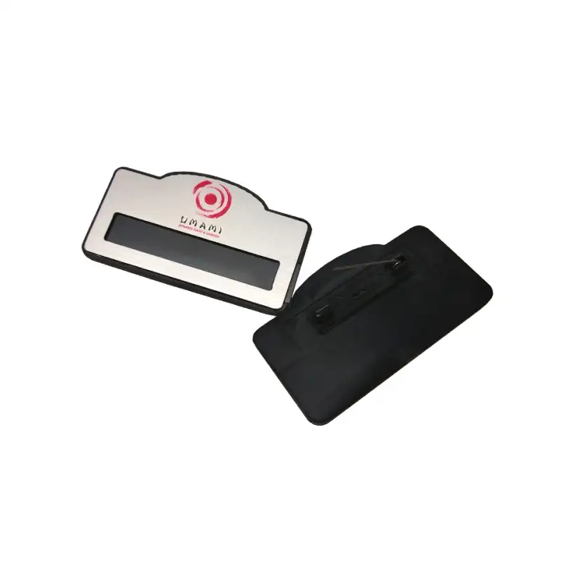 Този рекламен бадж се отличава със своята нестандартна овална трапецовидна форма, която придава модерен и динамичен вид на корпоративната идентичност. Моделът е снабден с функционален прорез за лесна подмяна на имената, което го прави изключително практичен за динамични екипи в сферата на обслужването. Висококачественият акрил с метален ефект в злато или сребро гарантира стилна и професионална презентация.
