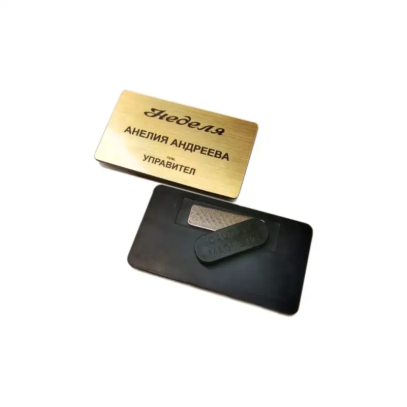 Този модел предлага най-всисокото ниво на персонализация, като съчетава произволна външна форма. Вече не е необходимо да поставяте хартиени вложки – всяко име се изработва като част от дизайна на баджа, осигурявайки безупречен и дълготраен професионален вид. С основа в злато или сребро, този аксесоар е идеалното лице на вашия бранд.