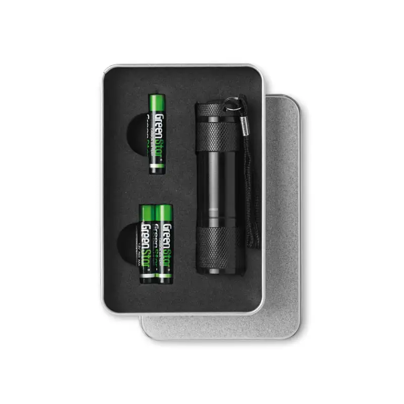 „НайнЛайт“ е компактно и надеждно фенерче с 9 LED светлини, което осигурява ярко и равномерно осветяване. Изработено от алуминий за здравина и лекота, то е идеален спътник за къмпинг, пътувания или ежедневна употреба. Доставя се с 3 батерии AAA и подвижна каишка за удобно носене, а елегантната метална кутия го превръща и в стилен подарък.