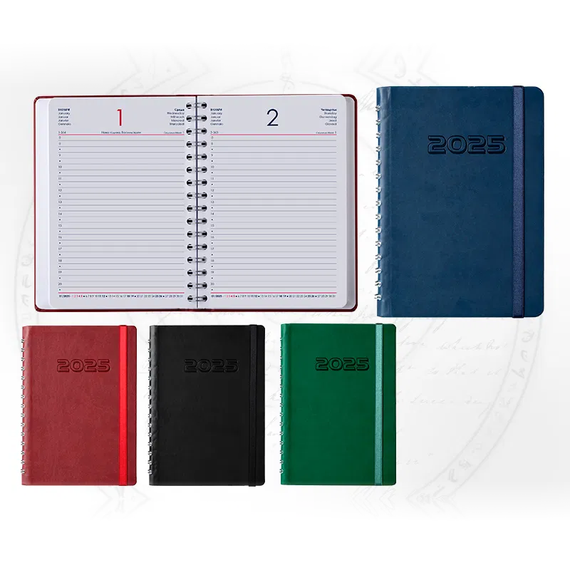 „Спирала Лукс“ съчетава луксозна корица от термоактивна кожа със сухо преге, с елегантно закръглени ъгли и ластик за допълнително удобство. Полускритата спирала осигурява лесно разгръщане и комфорт при писане. Вътрешността включва 352 страници с двуцветен печат на пет езика и 16 страници с полезна информация.