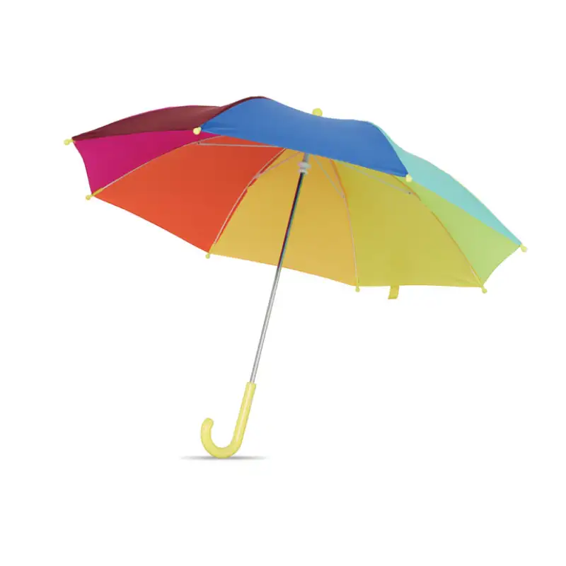 Весел и цветен детски чадър с шарка на дъгата, който носи настроение дори в най-дъждовните дни. Изработен от здраво 190T понге, с 8 панела и стабилна конструкция от фибростъкло. Лек и удобен за употреба, с ръчно отваряне и затваряне, пластмасова извита дръжка и върхове за безопасност.