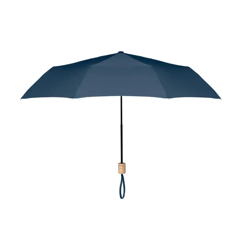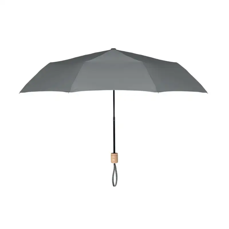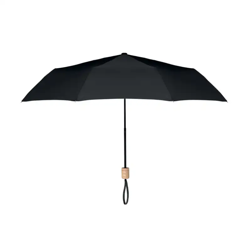 Изработен от 190T RPET понге плат с рамка в черно покритие и ребра, завършени с стилна дървена дръжка, той предлага комфорт и надеждност при всяко време.