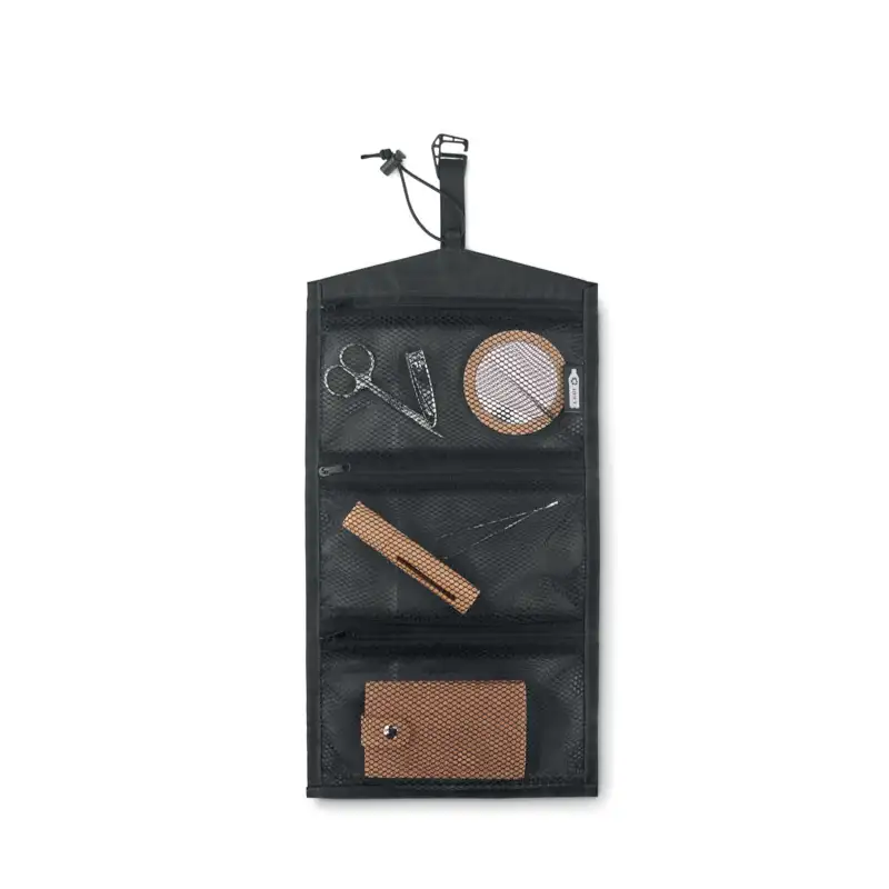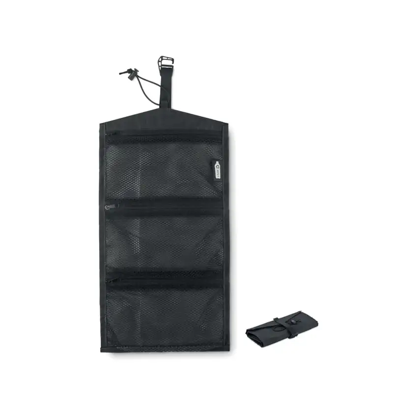 Многофункционална чанта-органайзер от 210D RPET с 3 отделения с цип и мрежа от RPET. Може да се използва и като козметична чантичка.
