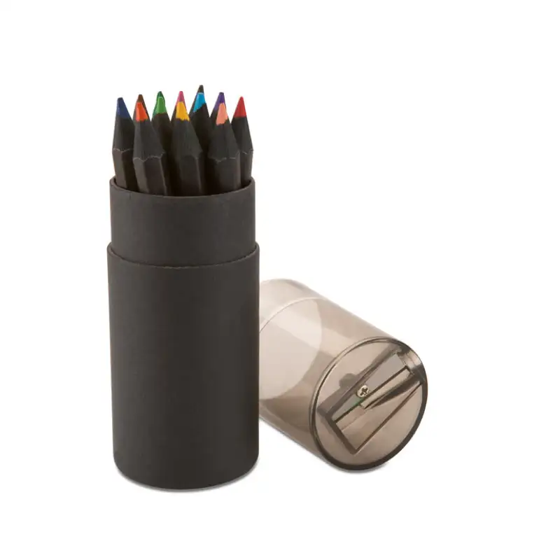 Стилна черна кутия от хартиена тръба, съдържаща 12 цветни молива и острилка, вградена в капака. Компактна и удобна за носене, тя е изработена от сертифицирани по FSC® материали, което я прави устойчив и екологичен избор.