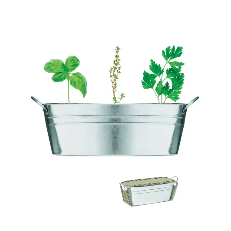 Създайте своя собствена малка билкова градинка у дома с тази стилна цинкова вана, включваща подбрани семена от три любими билки – босилек, мащерка и магданоз. Подходяща както за вътрешна употреба, така и за балкон, оранжерия или градина. Идеален начин да внесете свежест и аромат във вашата кухня!
