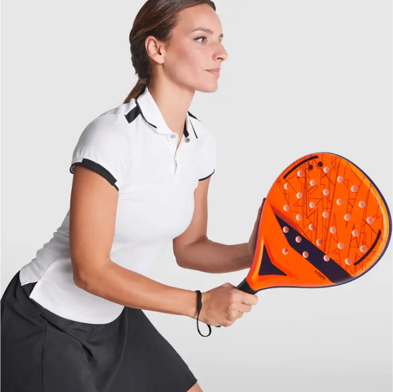 Спортна дамска поло тениска пике с къс ръкав, изработена от 50% рециклиран полиестер и 50% полиестер с плътност 140 г/м² – лека, дишаща и устойчива, подходяща за активна употреба.