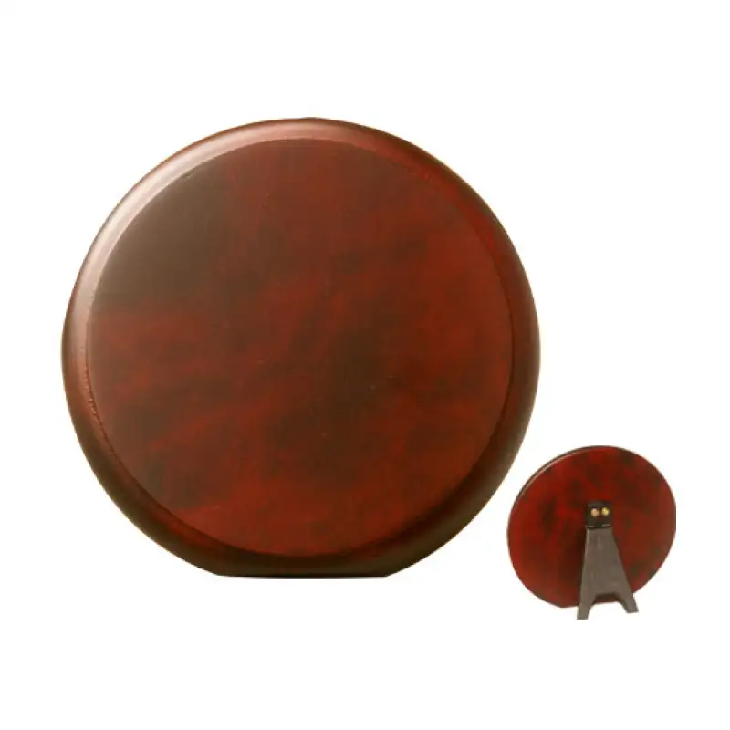 Елегантен дървен плакет с кръгла форма и стилна поставка, подходящ за награди, отличия и специални събития.