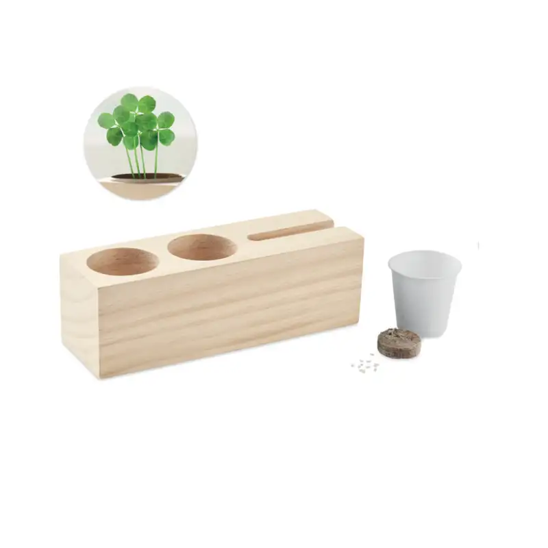 Внесете свежест и настроение в работното си пространство с „Късмет на бюрото“ – стилна дървена поставка с отделения за химикалка и телефон, която идва със семена от детелина и почвена таблетка. Засадете семената и наблюдавайте как израстват – може би ще се появи и четирилистна детелина за късмет.