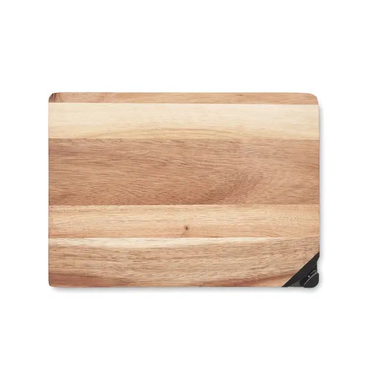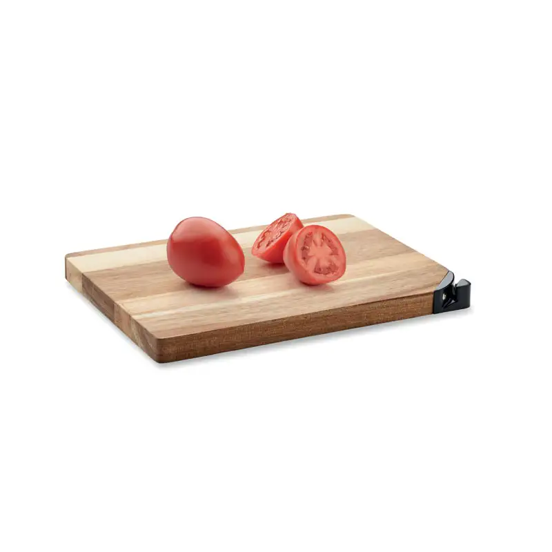Практична и стилна дъска за рязане, изработена от висококачествено акациево дърво, с вградена острилка за ножове. Комбинира функционалност и елегантен дизайн – идеална за ежедневна употреба в кухнята. Естествената текстура на дървото придава уникален вид на всяка дъска, като са възможни леки вариации в цвета и размера, характерни за натуралните материали.