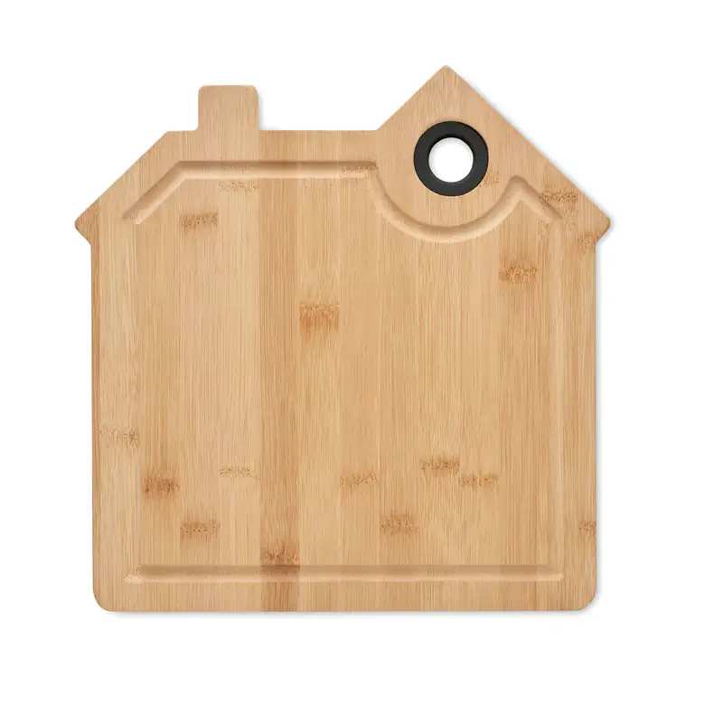 Очарователна дъска за рязане във формата на къща, изработена от висококачествен бамбук. Оборудвана с практичен жлеб за събиране на сокове и отвор за окачване, тя съчетава функционалност и декоративен дизайн. Подходяща за рязане, сервиране или като красив акцент във вашата кухня. Естественият бамбук придава индивидуален характер на всяка дъска – възможни са леки вариации в цвета и размера.