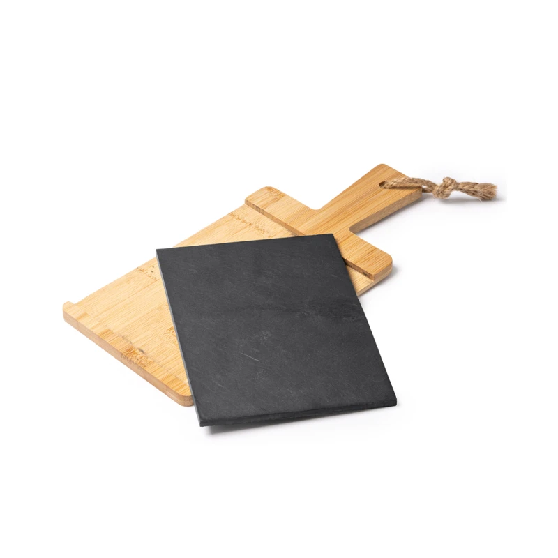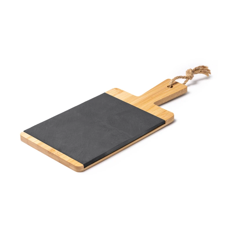 Тялото е изработено от устойчив бамбук, който предлага здрава и хигиенична повърхност за рязане, а вградената плоча от шисти позволява красиво представяне на храната.