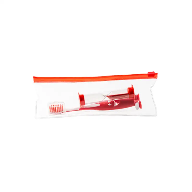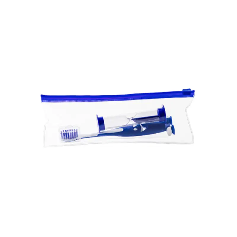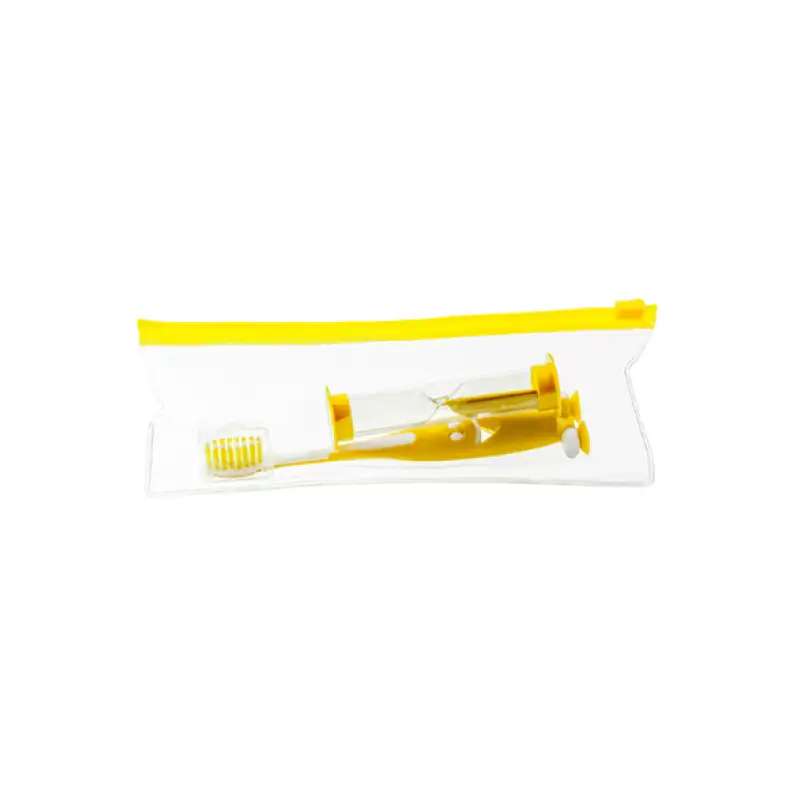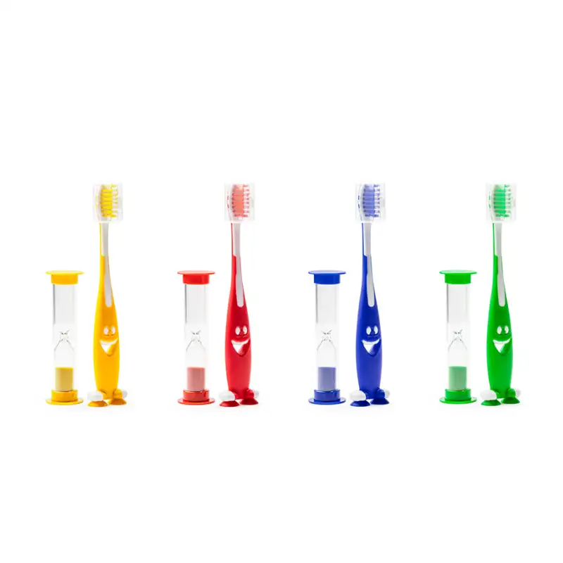 Практичен и забавен комплект за поддържане на детската устна хигиена. Четката за зъби е с цветен дизайн, мека на допир и снабдена с вендузи в основата за стабилно закрепване. Включеният 2-минутен пясъчен часовник в същия цвят превръща миенето на зъби в игра, като помага на децата да изградят правилен навик за продължителност на четкането.