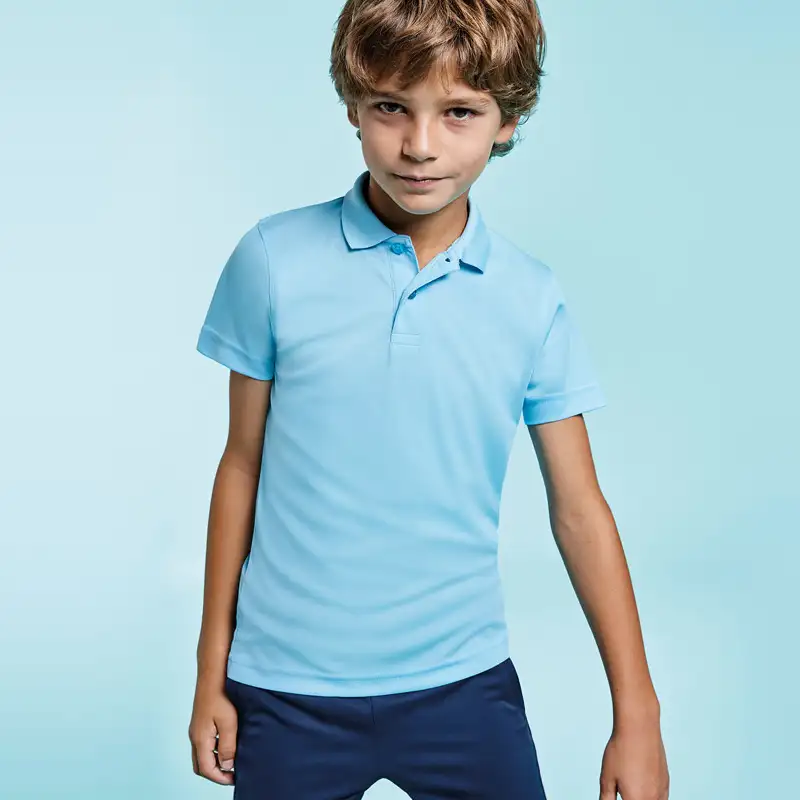 Спортна детска поло тениска пике с къс ръкав, изработена от 100% полиестер с плътност 150 г/м² – лека, дишаща и идеална за активна употреба.