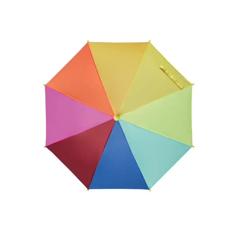 „Дъга“ е весел и цветен 18-инчов детски чадър с дължина 46 см, изработен от висококачествен 190T понге плат с пъстра шарка на дъгата, която ще зарадва всяко дете. Конструкцията с ребра и рамка от фибростъкло го прави лек, но устойчив, а безопасният дизайн е подходящ за малки ръчички.