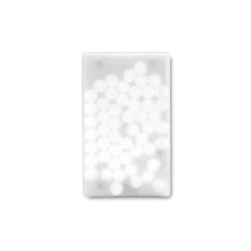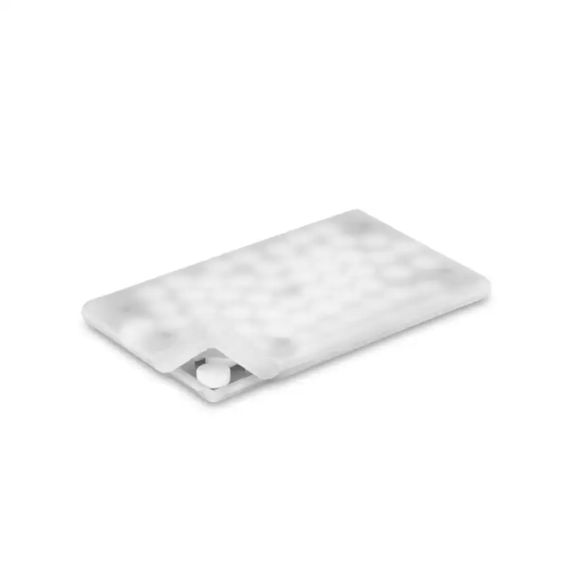 Компактен диспенсър за ментови бонбони с тънък дизайн във формата на кредитна карта, удобен за носене навсякъде.