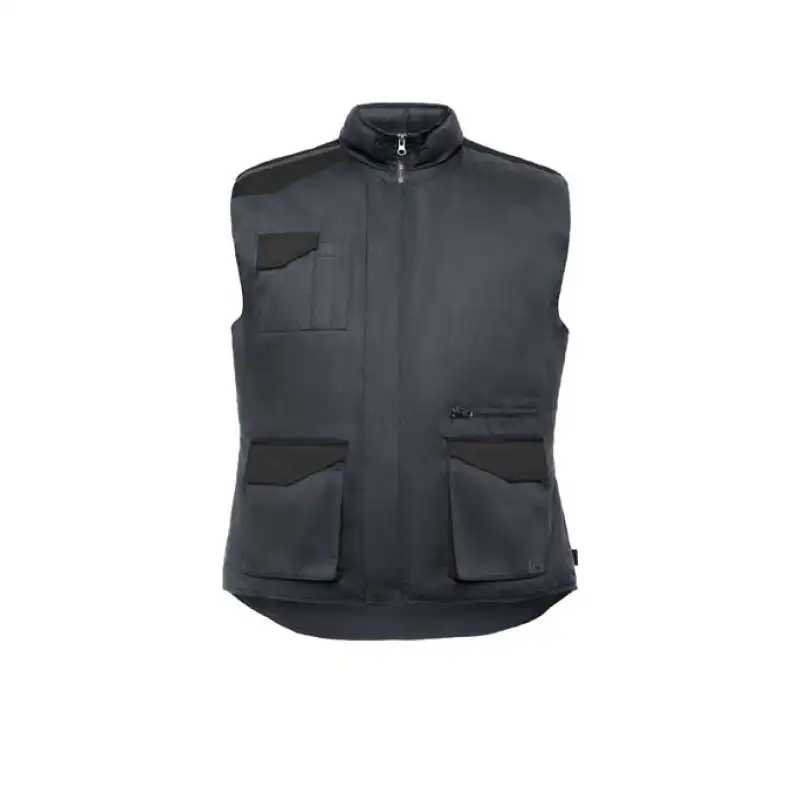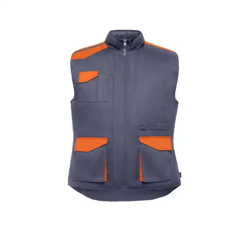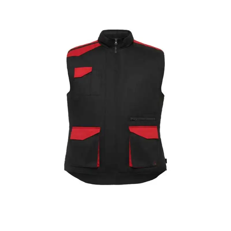 Дизайн: двуцветен работен елек с висока яка и удължен заден панел за допълнителна защита на кръста