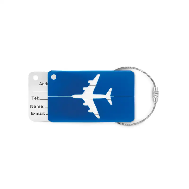 Здрав и лек етикет за багаж, изработен от алуминий. Включва поле за име и адрес, както и метален шнур с винтова връзка за сигурно закрепване към куфара. Идеален аксесоар за пътуване със стил и увереност.