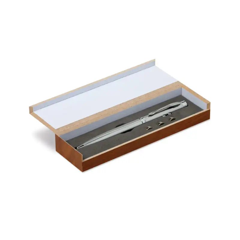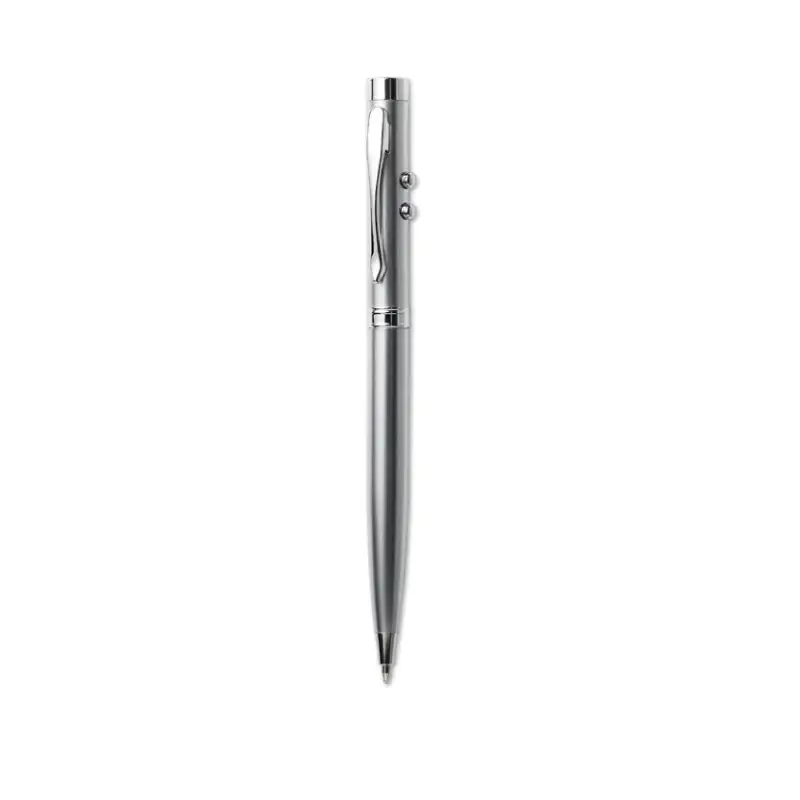 „СилвърПро“ е многофункционална сребърна химикалка, създадена за професионалисти, които ценят стил и удобство. Съчетава син пълнител с мастило, бяла LED светлина и червен лазерен показалец – идеална за писане, презентации и работа в слабо осветена среда. Представена в елегантна дървена кутия, тя е подходяща както за лична употреба, така и като подарък.