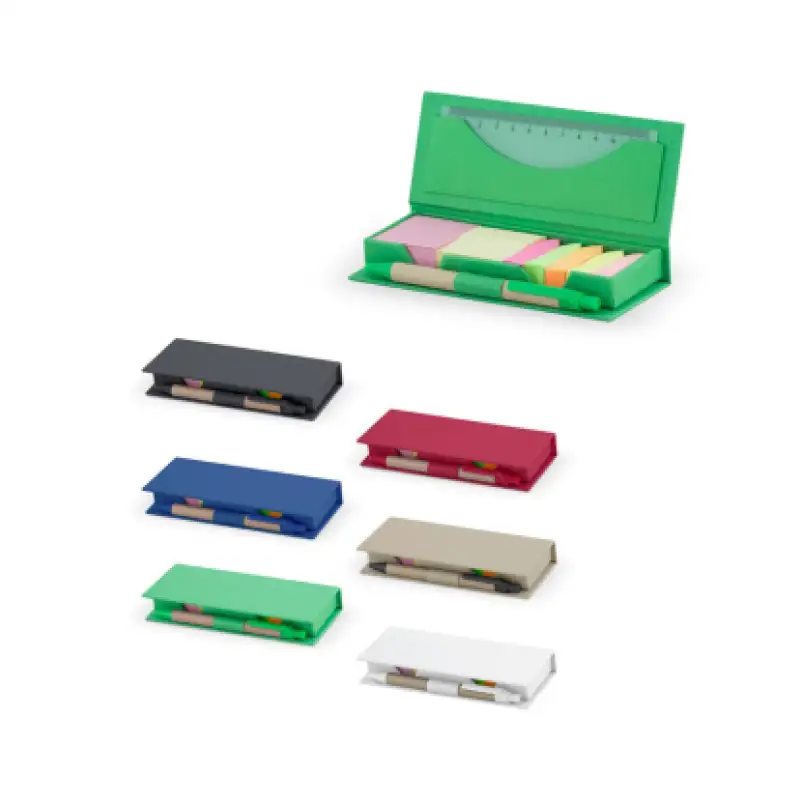 Картонената кутия „КолорНот “ предлага лепящи листчета , пластмасова линийка и химикалка от рециклирана хартия със синьо мастило.