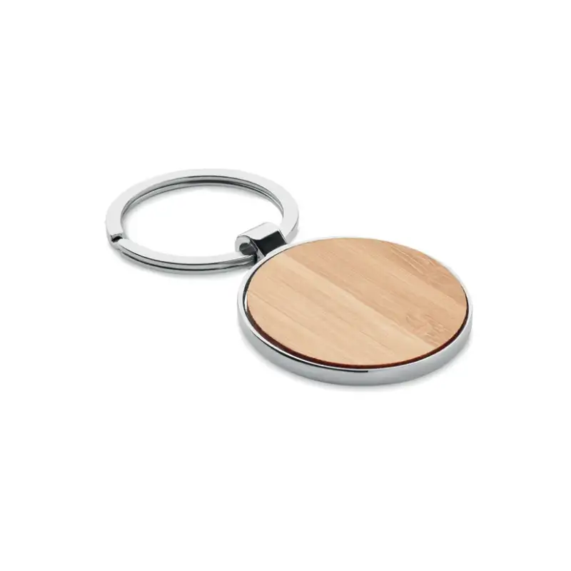 - Кръгъл ключодържател от цинкова сплав с предна част от бамбук – стилна комбинация от индустриална здравина и природна естетика