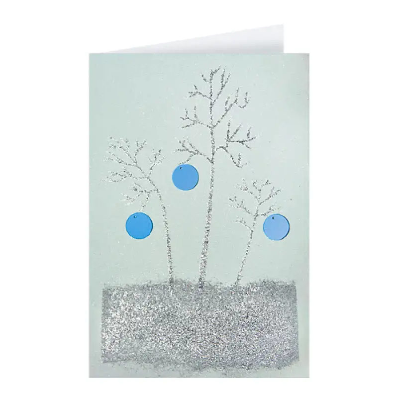 Ръчно изработени коледни картички – всяка от тях е създадена на ръка чрез лепене, връзване, нанасяне на брокат, изрязване… Картичките са предварително изработени, но в ограничени серии (около 100 броя). С дизайн от празнични дръвчета, те носят усещане за уют, зимна свежест и празнично настроение. Към всяка картичка получавате безплатен бял плик, а по желание могат да се добавят луксозни варианти от перлени, релефни или цветни хартии.
