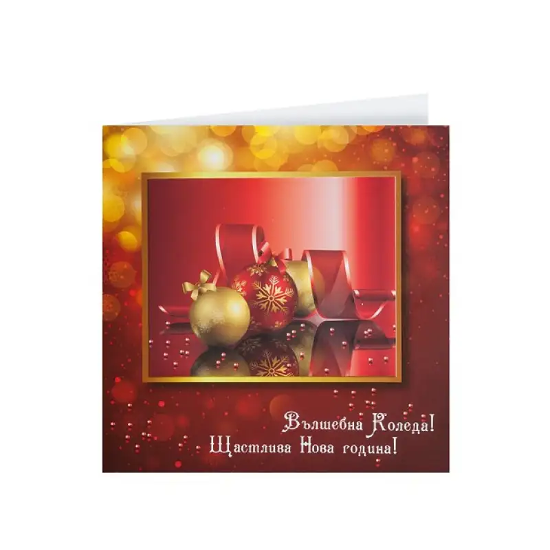 Поздравителна картичка „Класическа празнична визия“, създадена в традиционен стил за Коледа и Нова година. Подходяща за корпоративни и лични пожелания. Включва стандартен бял плик, а по желание могат да се добавят луксозни варианти от перлени, релефни или цветни хартии. Възможност за персонализация с фирмено лого и празнични послания.