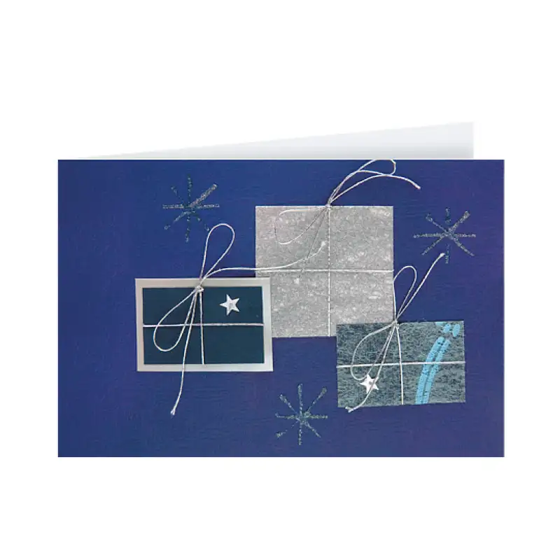 Ръчно изработени коледни картички – всяка от тях е създадена на ръка чрез лепене, връзване, нанасяне на брокат, изрязване… Картичките са предварително изработени, но в ограничени серии (около 100 броя). В класически син цвят, те носят усещане за зимна свежест и празнична хармония. Към всяка картичка получавате безплатен бял плик, а по желание могат да се добавят луксозни варианти от перлени, релефни или цветни хартии.