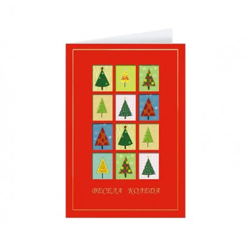 Поздравителна картичка „Свежо настроение“, отличаваща се със съвременен и жизнерадостен коледен дизайн. Подходяща за корпоративни и лични пожелания, тя носи празнична енергия и стил. Включва стандартен бял плик, а по желание могат да се добавят луксозни варианти от перлени, релефни или цветни хартии. Възможност за персонализация с фирмено лого и празнични послания.