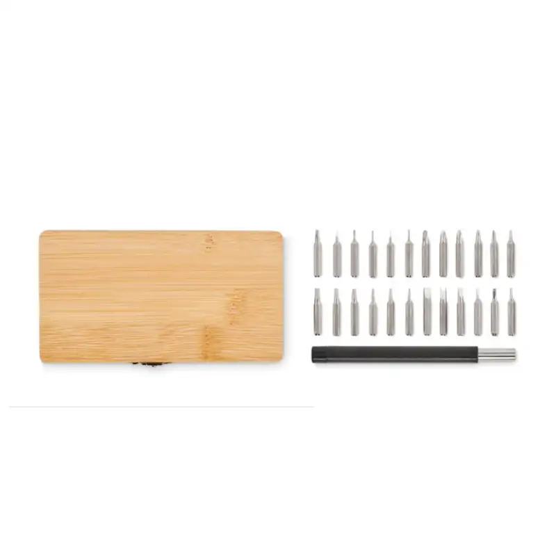 „Бамбук Прециз 24“ е стилен комплект от 24 малки прецизни инструменти за ремонт на отвертки, представен в елегантен бамбуков калъф с катарама. Практичен и компактен, той е идеален за фина работа и дребни ремонти у дома, в офиса или при пътувания. Естественият бамбук придава уникален и устойчив характер на всеки калъф – възможни са леки вариации в цвета и размера, които подчертават автентичността на материала.