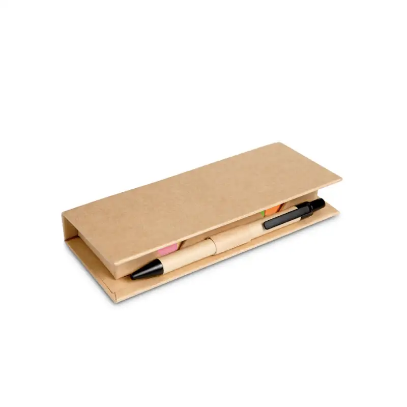 „Еко Сет“ е практичен органайзер от рециклиран картон, включващ лепящи бележки в два цвята, 5 цветни маркера за страници и химикал с хартиен корпус и синьо мастило.