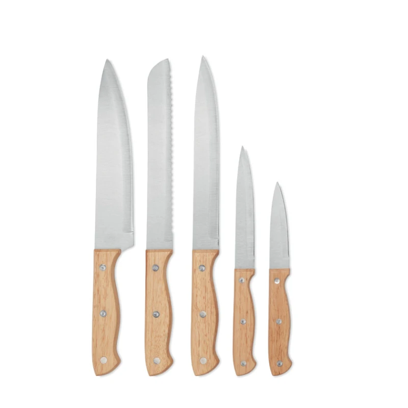 Комплектът включва: нож за готвач, нож за хляб, нож за нарязване, мултифункционален нож и нож за белене, всички пасващи перфектно в стилния дървен държач.