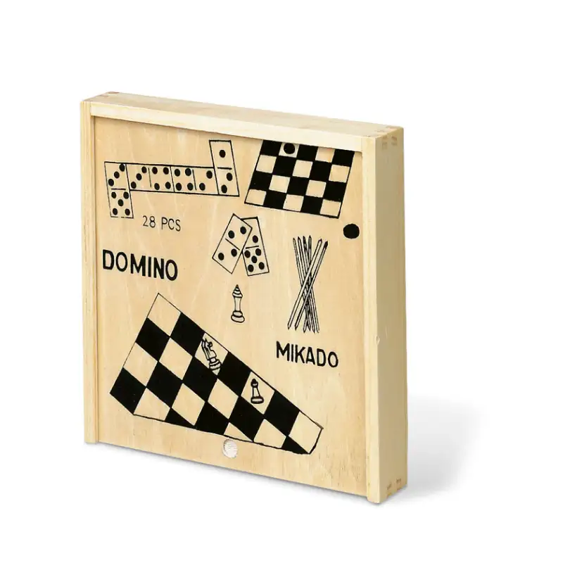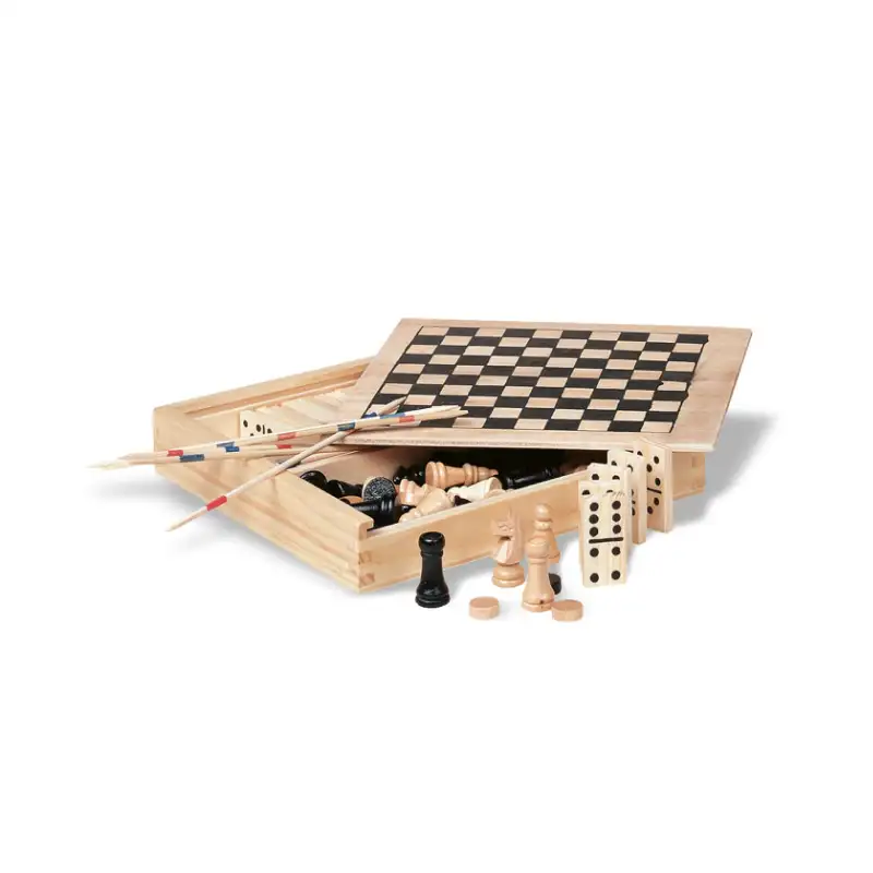 „4 в 1“ е универсален дървен комплект, който съчетава четири класически настолни игри – домино, шах, шашки и дървени пръчки (Микадо). Всички игри са събрани в елегантна дървена кутия, която осигурява удобство при съхранение и пренасяне. Това е чудесен избор за семейни вечери, пътувания или подарък, който носи часове забавление и развива логическо мислене, концентрация и стратегически умения.