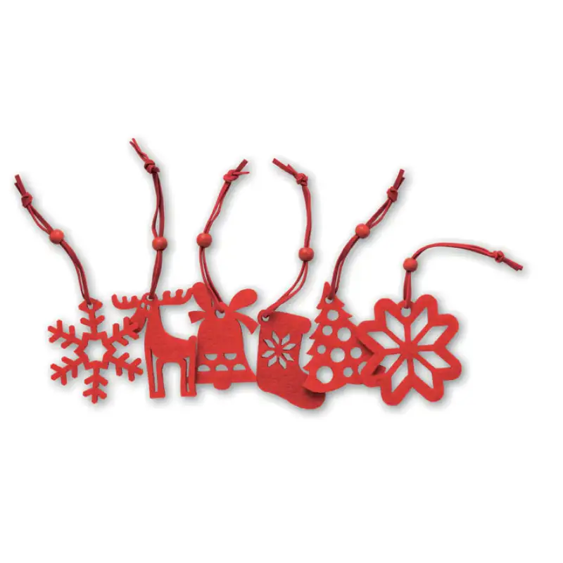 „Филцови форми“ е комплект от 6 червени коледни играчки за елха, изработени от мек PET филц – устойчив материал, получен от рециклирана пластмаса. Включва шест различни дизайна: елха, снежинка, камбанка, ботуш, коледна звезда и елени. Леки и лесни за поставяне, те придават топъл, традиционен и природосъобразен акцент на празничната украса.