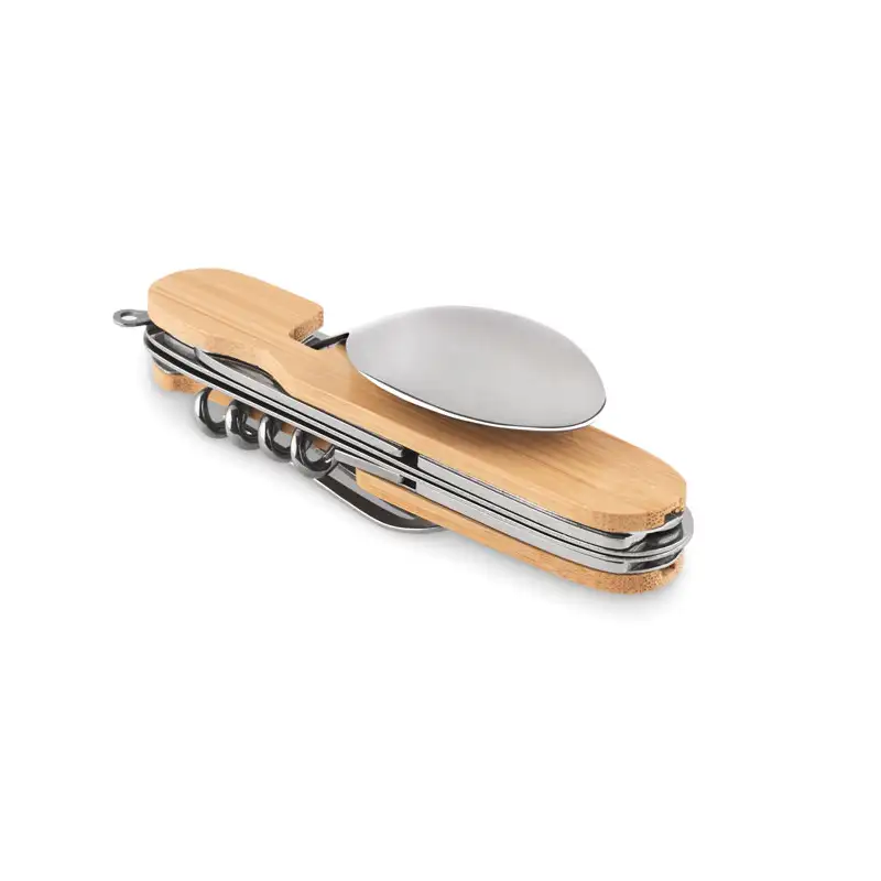Комплектът включва 5 функции: вилица, лъжица, нож, отварачка за консерви и отварачка за вино. Частите могат да се разделят на две, за по-лесно използване и почистване. Поради естествения произход на дървото, може да има леки вариации в цвета и размера на корпуса, което прави всеки комплект уникален.