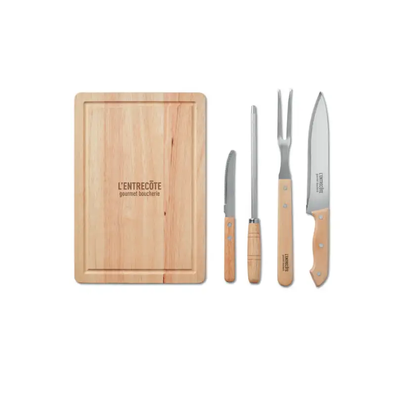 Професионален комплект от 4 аксесоара за барбекю, включващ сатър, нож, вилица и точило. Всички инструменти са изработени от висококачествена неръждаема стомана с удобни дървени дръжки от бамбук. Комплектът идва с дъска за рязане и е представен в практична полиестерна торбичка за лесно съхранение и пренасяне. Естественият бамбук придава уникален вид на всеки артикул, като са възможни леки вариации в цвета и размера.