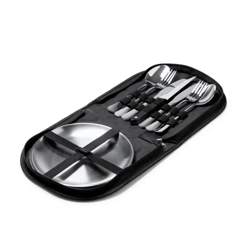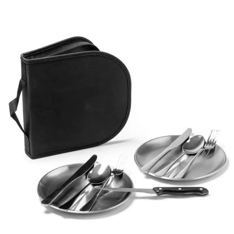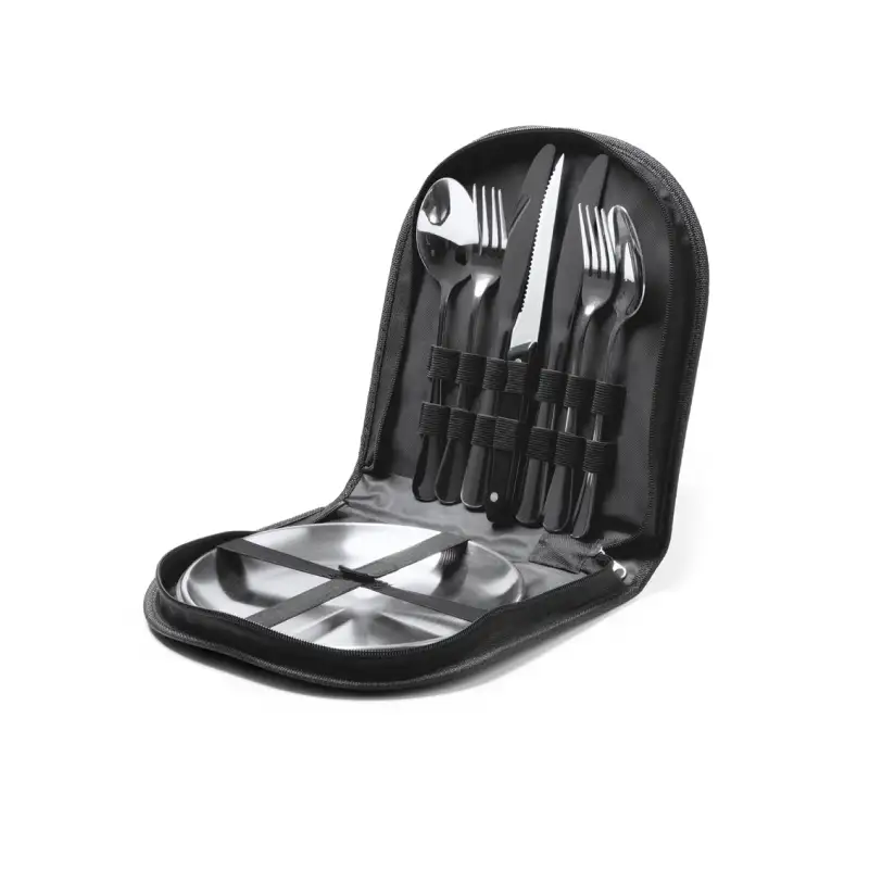 „Тривор“ е практичен и издръжлив комплект за хранене, създаден за удобство при пътувания, пикници или къмпинг. Изработен от висококачествена неръждаема стомана, той е устойчив и подходящ за многократна употреба. Всички елементи се съхраняват компактно в калъф от рециклиран RPET с цип и дръжка, което го прави лесен за пренасяне и екологичен избор.