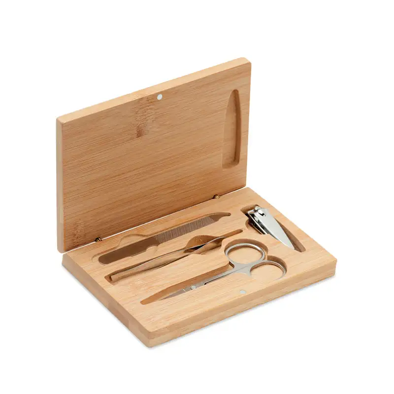 Пълен комплект за маникюр, включващ всичко необходимо за поддържане на перфектни нокти: извита ножица за нокти, нокторезачка, пила и пинсета – всички изработени от висококачествена неръждаема стомана.