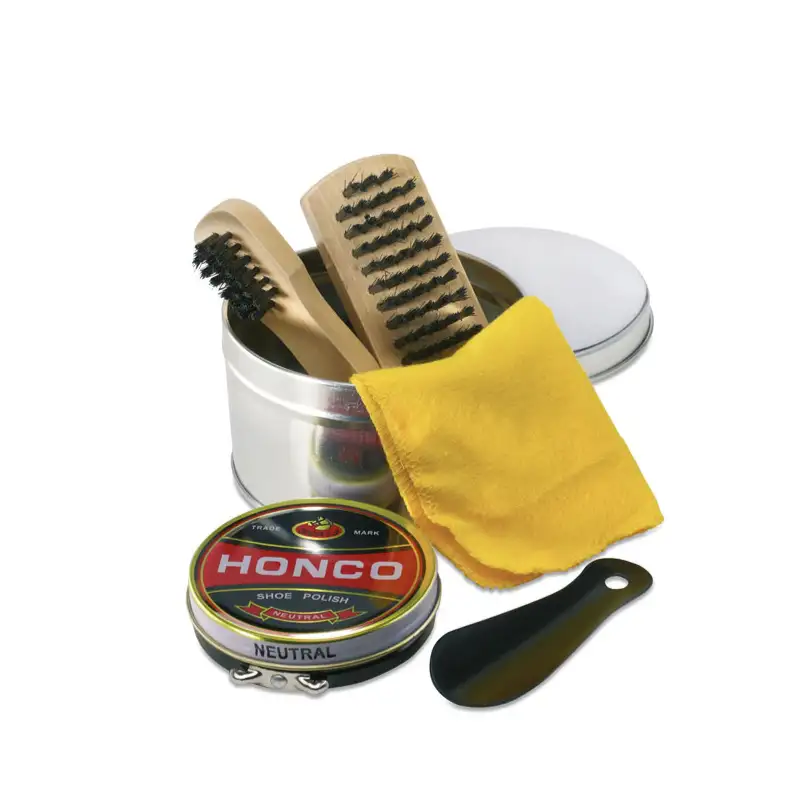 Комплект от 5 части за боядисване на обувки в метална подаръчна кутия, включва жълта кърпичка, лопатка за обувки, голяма четка, малка четка за детайли и боя в неутрален цвят.
