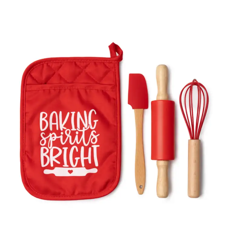 „Коледна пекарна“ е практичен и празничен кухненски комплект, създаден за любителите на домашно приготвените сладки. Състои се от три основни инструмента – точилка, бъркалка и шпатула – всички с коледен дизайн, които вдъхновяват за вкусни и весели моменти в кухнята. Комплектът включва и терморъкавица, която служи и като удобна опаковка за съхранение на аксесоарите.