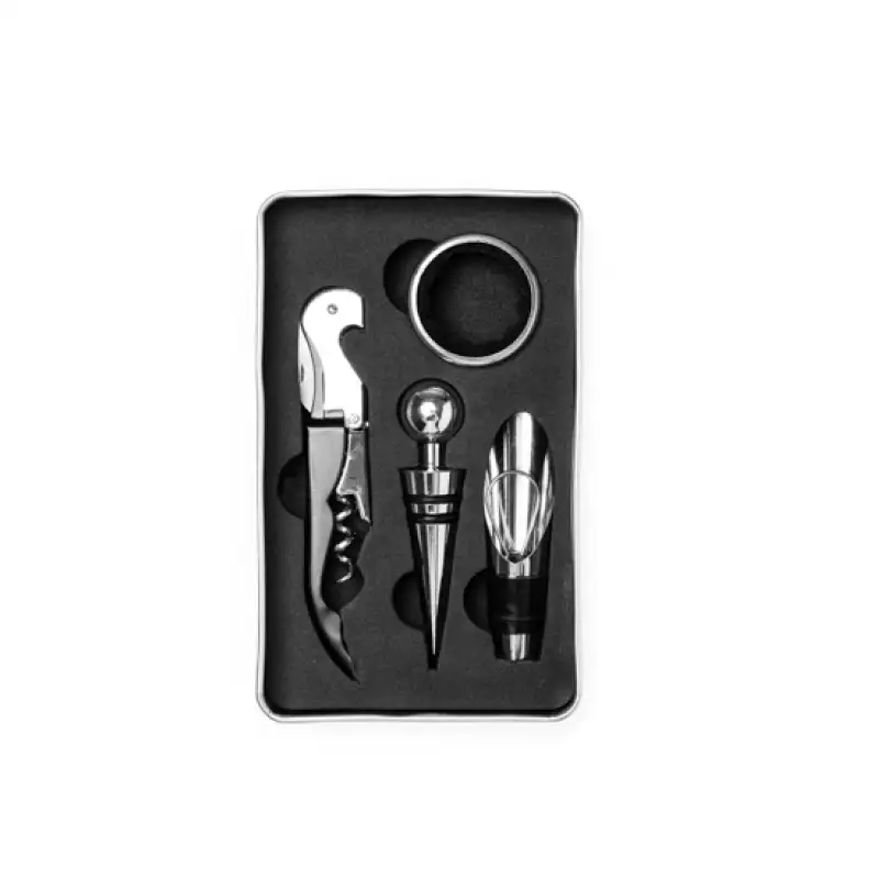 Насладете се на изтънчено винено изживяване с комплекта за вино „Сомелиер“, изработен от висококачествена неръждаема стомана. Събран в елегантна кутия, той съдържа всички необходими аксесоари за сервиране и съхранение на вино: