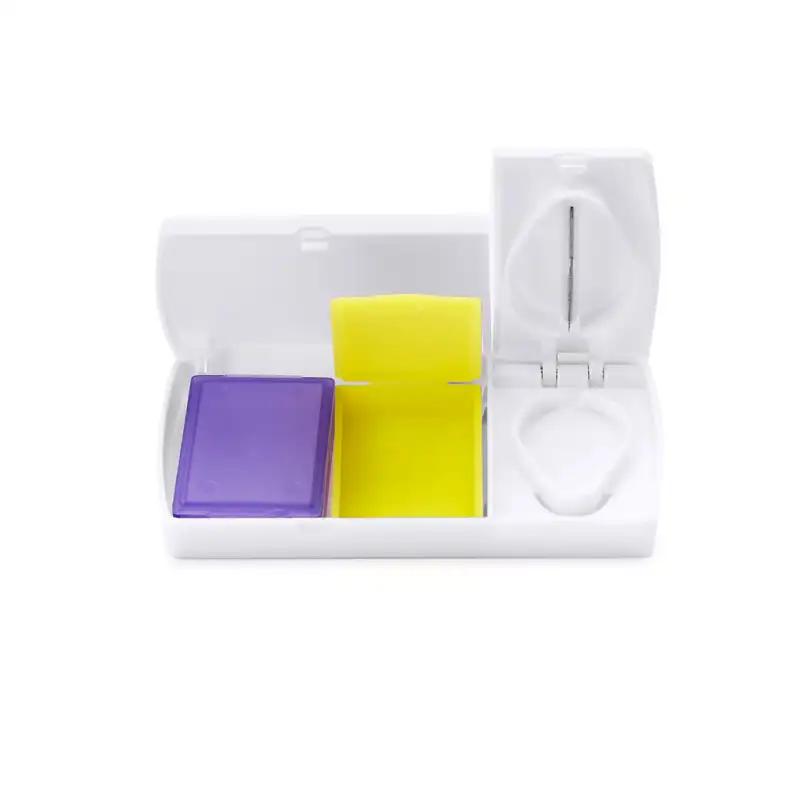 Практична пластмасова кутия за хапчета с две секции – едната с две двуцветни контейнери, а другата с фреза за разделяне на таблетки с по-голям обем.