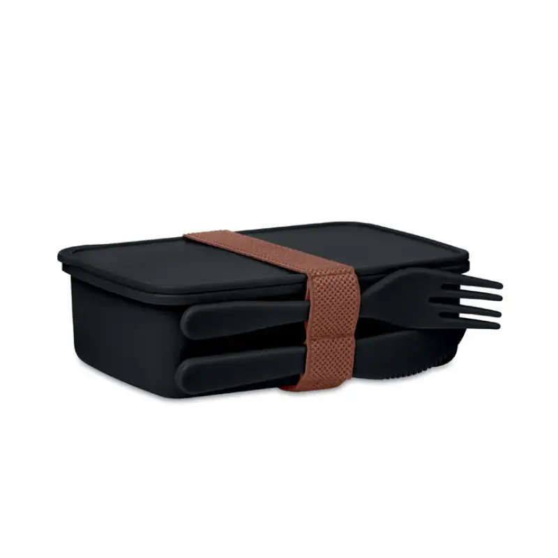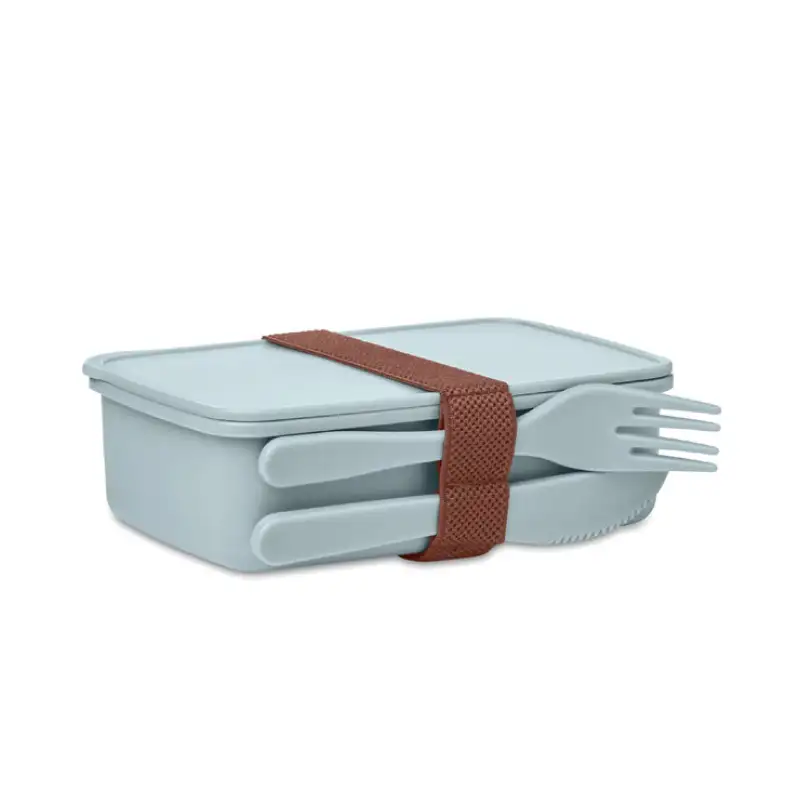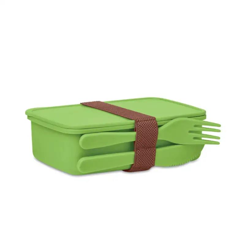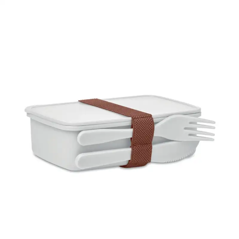 В комплекта са включени нож и вилица, изработени от същия устойчив PP материал, което прави кутията удобна и готова за употреба навсякъде.
