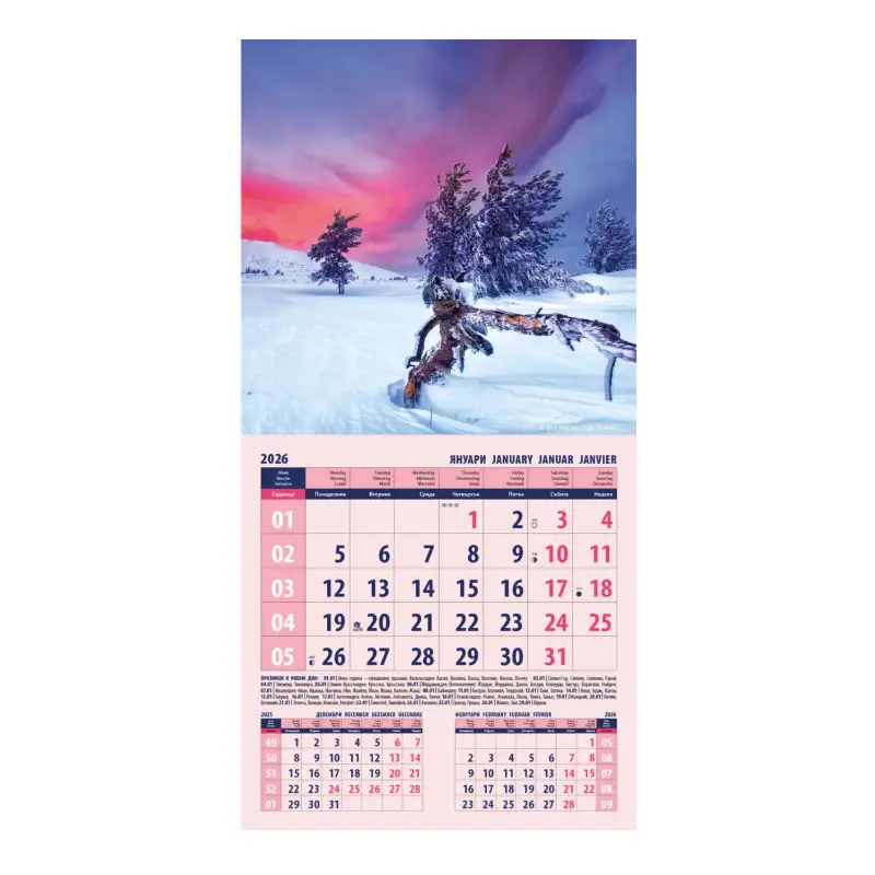 Стенен календар „Природа България“ – 12-листов луксозен модел, който представя 12 колоритни пейзажа от България. Всяка страница носи красотата на родната природа и създава усещане за хармония и вдъхновение. Подходящ за компании, които искат да асоциират своя бранд с автентичност, национална идентичност и естетика.