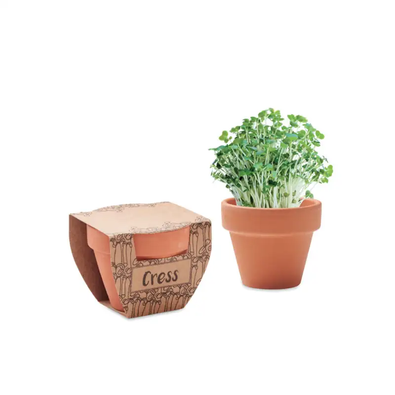 Добавете зелено докосване към дома си с тази малка глинена саксия от теракота, която съдържа семена от кресон и почвена таблетка за лесно засаждане. Подходяща е за дома, офиса или като оригинален еко подарък.