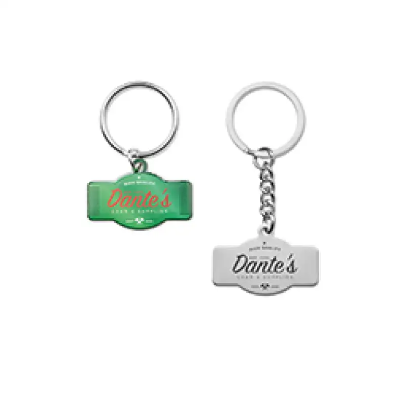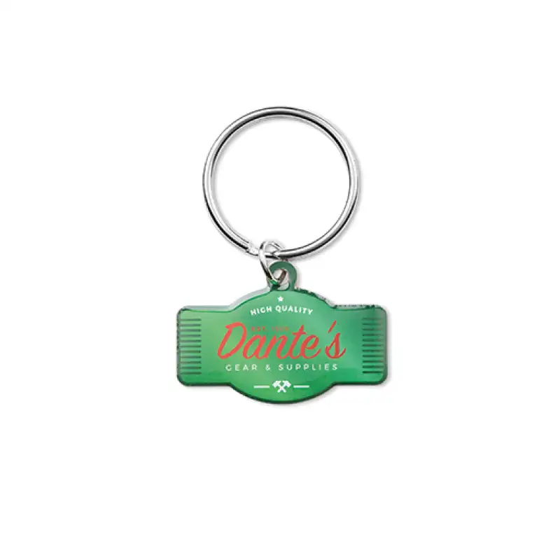 Рекламен метален ключодържател по индивидуална форма, изрязан по контур, с пълноцветен обемен стикер от едната страна. Стикерът осигурява ярки цветове, дълбочина и гланцов 3D ефект.