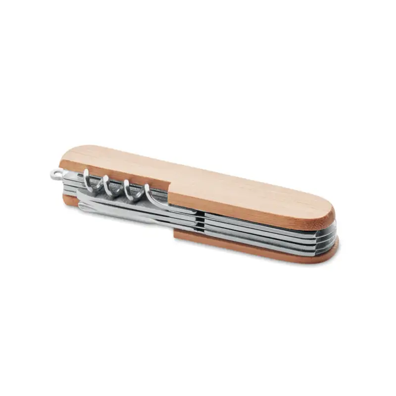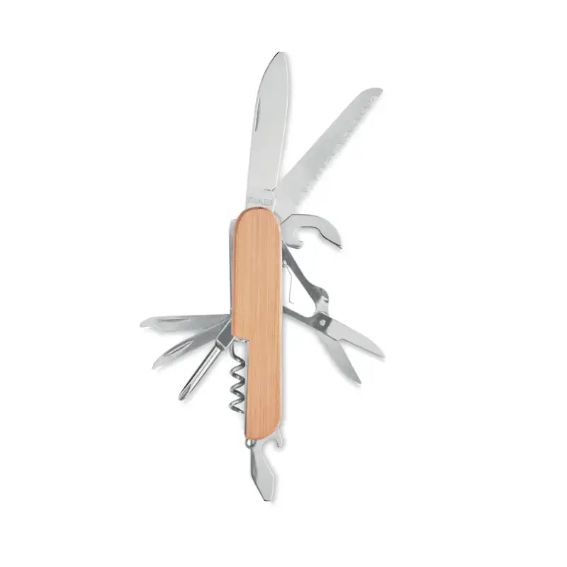„Бамбио“ е стилно и практично джобно ножче с 9 функции, изработено от висококачествена неръждаема стомана и елегантен калъф от естествен бамбук. Компактният му размер и лек дизайн го правят удобен за носене в джоб или раница, а разнообразните му приложения – идеален спътник за къмпинг, пътувания или ежедневни ситуации. Естественият бамбук придава уникален характер на всеки артикул, като са възможни леки вариации в цвета и размера.