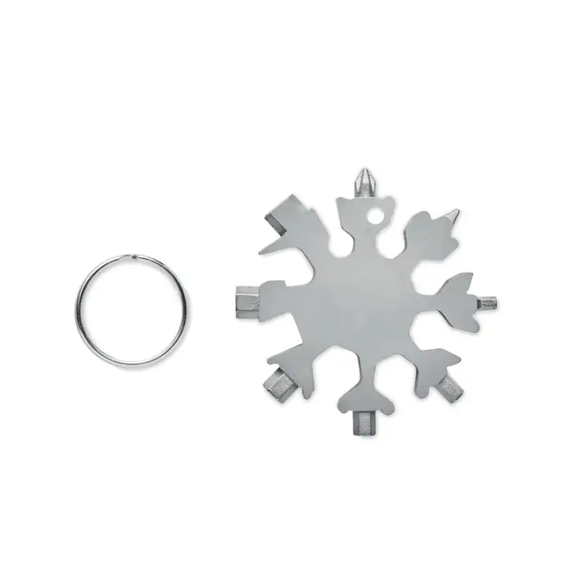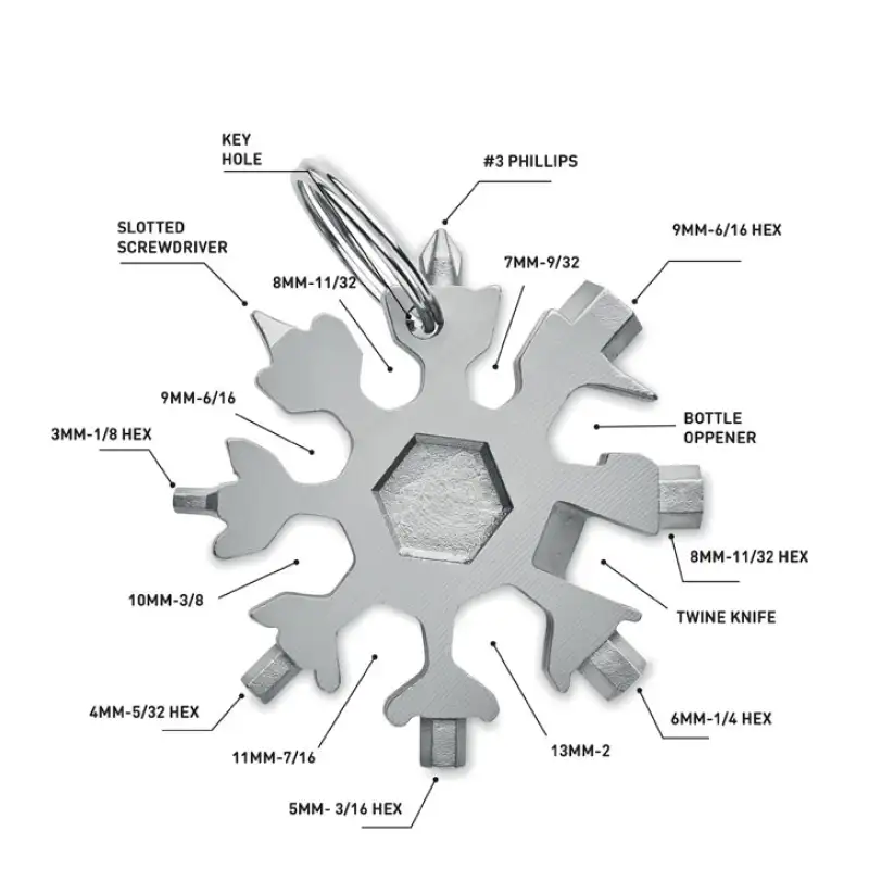 „Снежинка 17“ е компактен и издръжлив мултифункционален инструмент от неръждаема стомана, който съчетава 17 различни функции в елегантна форма на снежинка. Практичен и удобен за носене, той е идеален за „Направи си сам“ проекти, любители майстори и ежедневни ситуации. Включеният метален пръстен позволява лесно прикрепяне към колан с инструменти, ключодържател или раница, така че винаги да е под ръка.