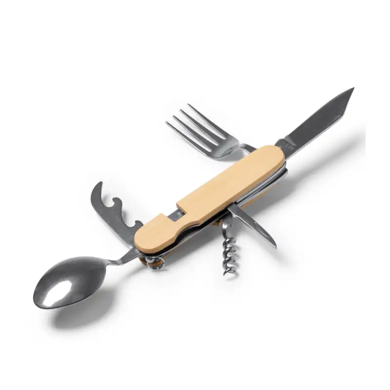 Комплектът включва: мултифункционални прибори, тирбушон, джобно ножче, кутия от екологичен материал