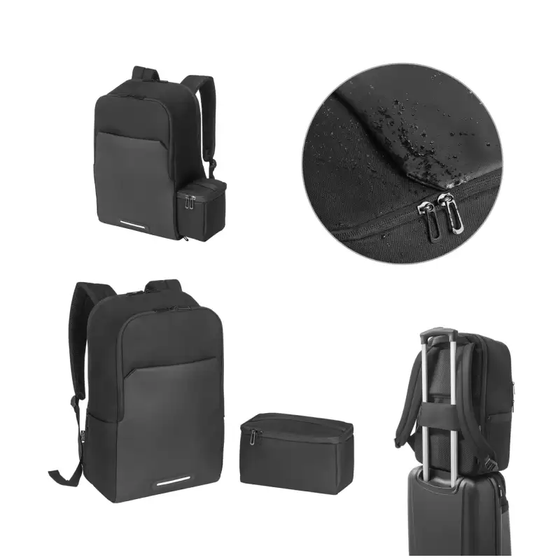Включва предно отделение с подвижна преграда за термо чантата, преден джоб с цип, страничен джоб за бутилка, светлоотразителни детайли и презрамка за закачане за куфар.